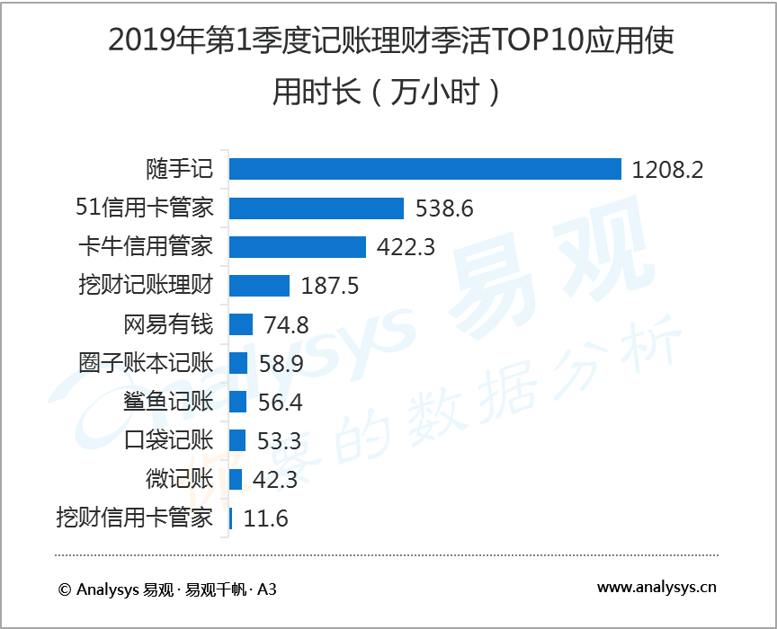 5月24日,知名互聯網數據研究機構易觀 Analysys發布了2019年第1季度記賬理財行業報告,數據顯示,2019年第1季度,在國內記賬類應用中,隨手記以1041.7萬活躍用戶規模蟬聯榜首,卡牛信用管家和51信用卡管家分別以683.4萬和495.3萬活躍用戶規模居行業二、三位。