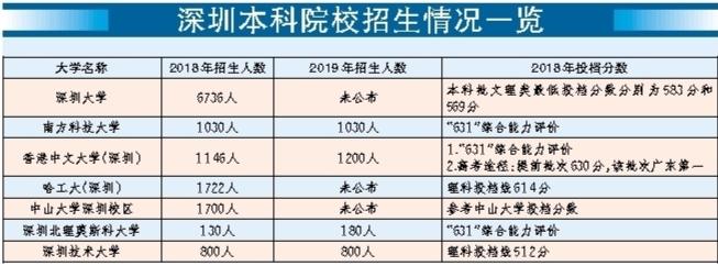 在目前已經(jīng)公布今年招生計劃的深圳高校中,深圳技術(shù)大學(xué)于2017年、2018年分別依托深圳大學(xué)招收226名及807名全日制本科生;2018年11月30日,深圳技術(shù)大學(xué)獲教育部發(fā)函正式成立,于2019年進(jìn)行首年獨(dú)立招生。記者從該校獲悉,深圳技術(shù)大學(xué)今年的招生數(shù)量與去年基本持平,計劃招收6個專業(yè)11個方向的800名新生。2019年,香港中文大學(xué)(深圳)預(yù)計在全國26個省市(自治區(qū))共招收本科生1200人,相比去年稍有增加。南科大也表示,今年計劃招收本科生1030人,與2018年的招生人數(shù)相差無幾。深圳北理莫斯科大學(xué)今年將啟用永久校區(qū),招生人數(shù)從去年的130人擴(kuò)大到了180人。