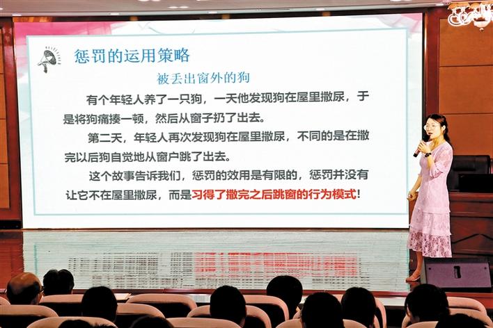 講座中,齊玲老師介紹三體腦精神,然后圍繞“馬斯洛需求層次理論”五個板塊結合實例進行具體講解:一、生理需求;二、安全需要,根據羅森塔爾效應,指出教師應以積極發展的眼光看待孩子;三、社交需要;四、尊重的需要,從內部認可的鼓勵到外部認可的鼓勵會導致“德西效應”;五、自我實現需求。期間,她通過各項案例,以常見的心理問題為例,層層推進,逐步告訴老師們面對此類問題的解決辦法,令老師們受益匪淺。