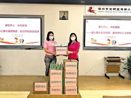 近日,光明區馬田小學六(3)班羅心如家長向學校捐贈口罩1000只、消毒液200瓶等愛心物資。