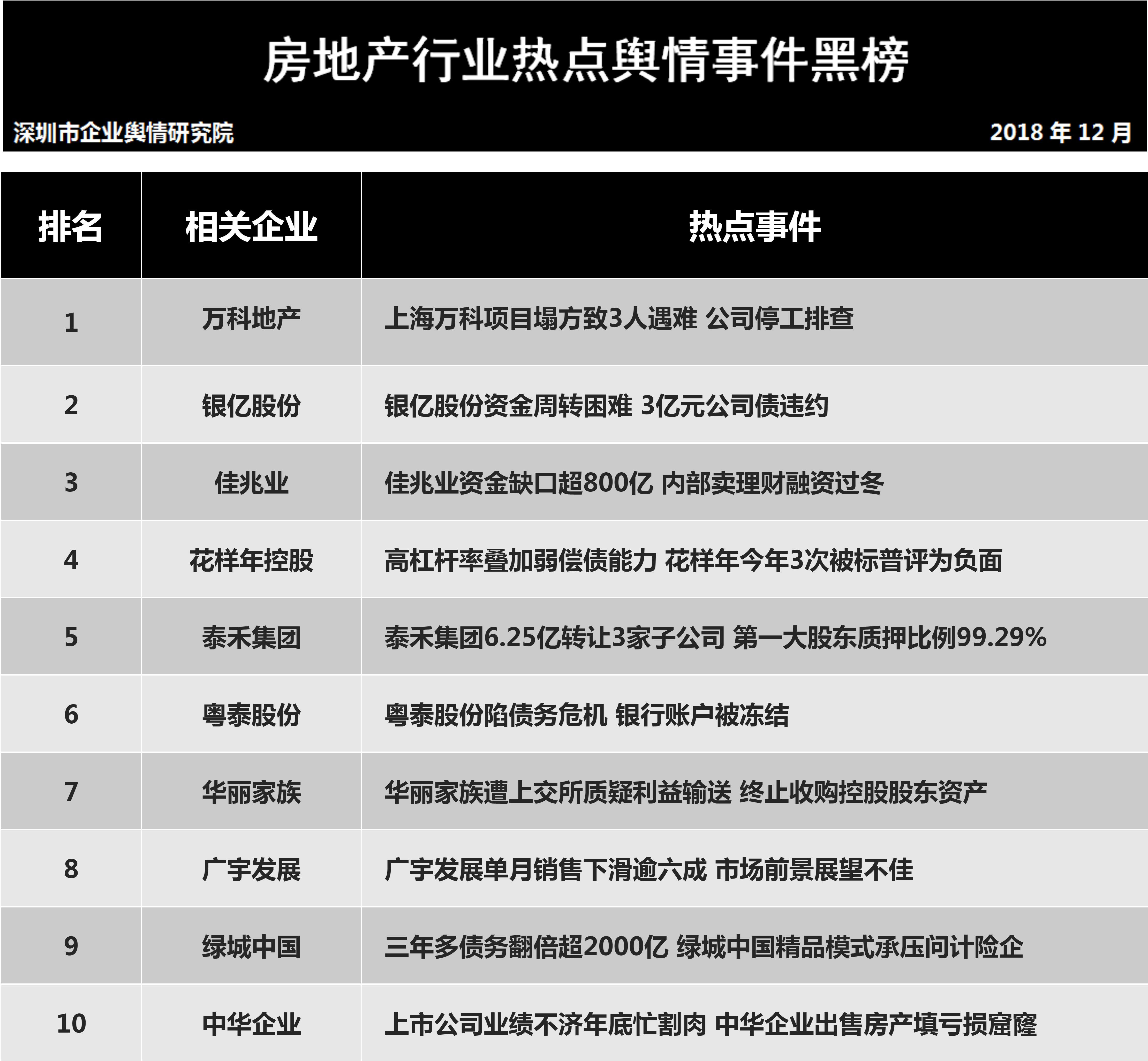 深圳新聞網2019年1月7日訊 (記者田志強 通訊員陳文光)1月7日,深圳企業輿情研究院發布第十一批企業輿情榜單。本次榜單重點聚焦房地產及醫藥保健兩個行業。房地產行業企業輿情榜單由房地產行業熱點輿情事件排行榜(紅、黑榜)及房地產企業公眾形象排行榜組成。