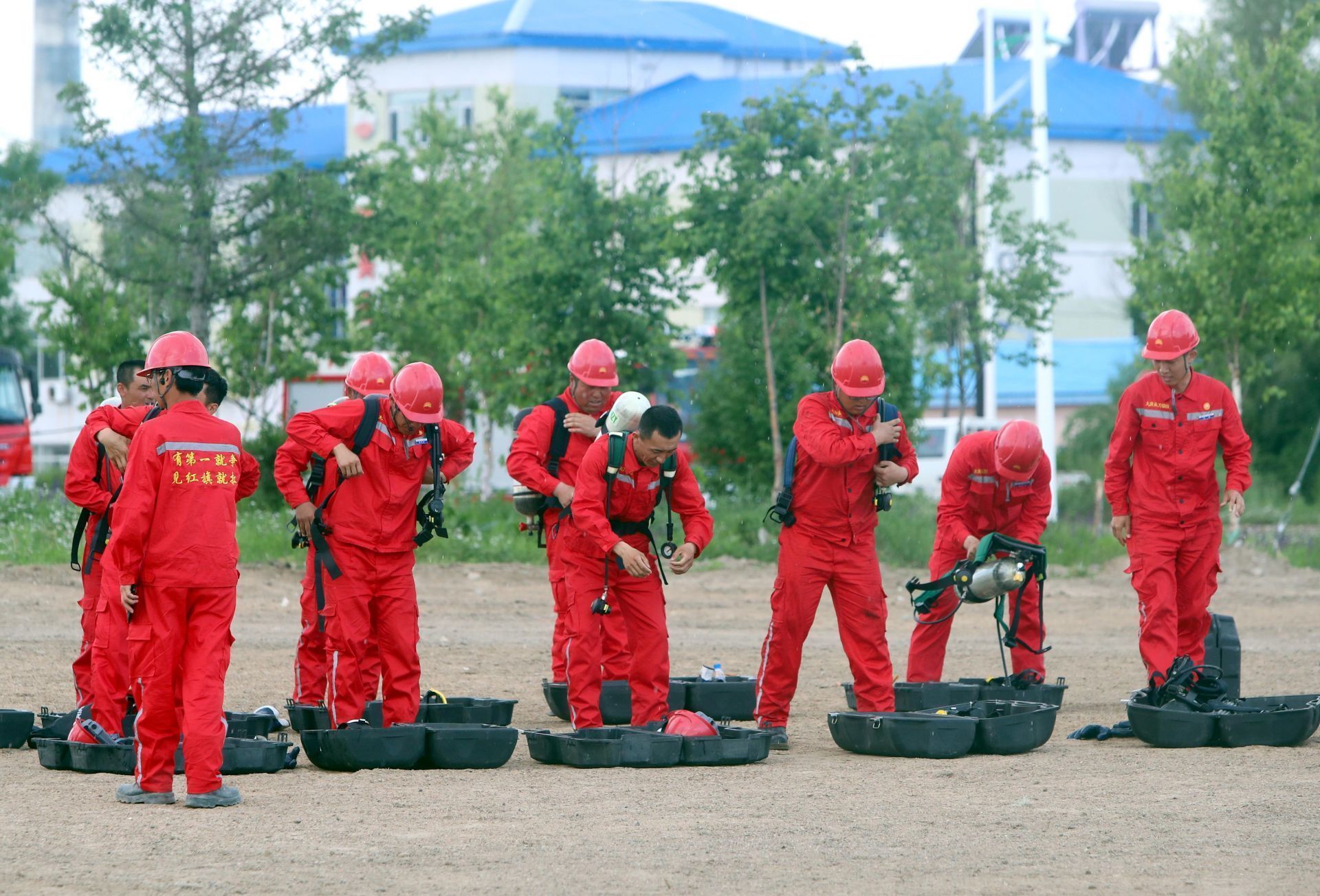 1202尖刀隊鉆井隊員在進行應急事故演練。