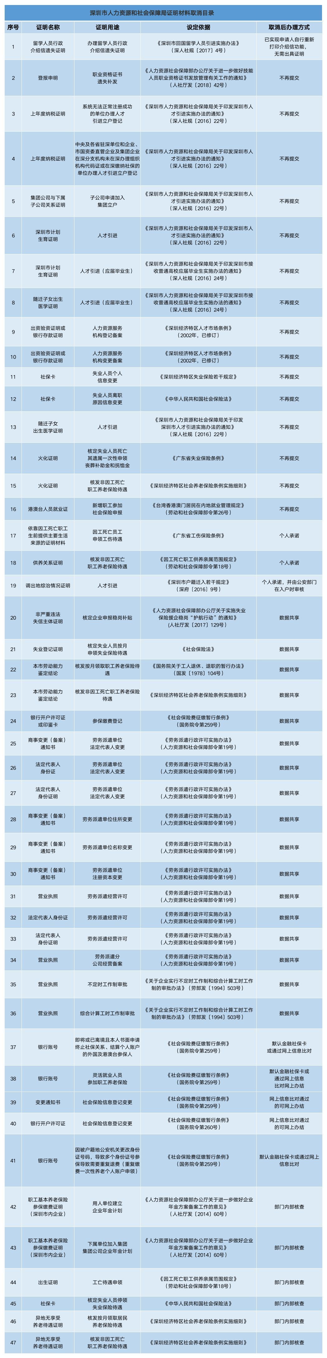 深圳新聞網2019年7月25日訊(見圳客戶端、深圳新聞網記者 施冰冰)據“深圳人社”微信公眾號消息,為了減證便民、優化服務,深圳市人力資源和社會保障局取消了47項證明材料。其中包括新增職工參加社會保險申報,港澳臺人員就業證不用再提交;人才引進(應屆畢業生),深圳市計劃生育證明、隨遷子女出生醫學證明無需再提交;勞務派遣單位法定代表人變更,法定代表人身份證、商事變更(備案)通知書等實現數據共享等等等等……