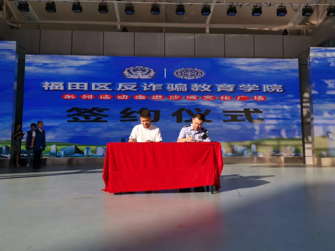 活動現場,肖劍平所長與沙頭街道辦黨工委副書記熊新清及沙嘴實業股份有限公司簽署了《福田反詐騙教育專刊》戰略合作協議。