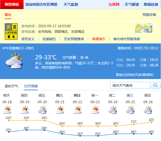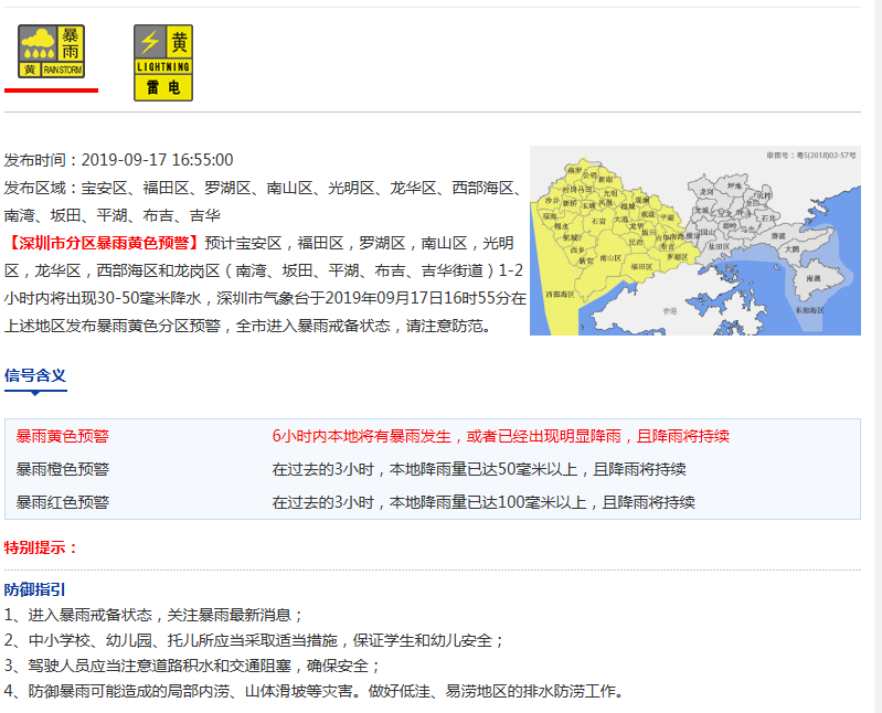 市氣象局預計寶安區,福田區,羅湖區,南山區,光明區,龍華區,西部海區和龍崗區(南灣、坂田、平湖、布吉、吉華街道)1-2小時內將出現30-50毫米降水,深圳市氣象臺于2019年09月17日16時55分在上述地區發布暴雨黃色分區預警,全市進入暴雨戒備狀態,請注意防范。
