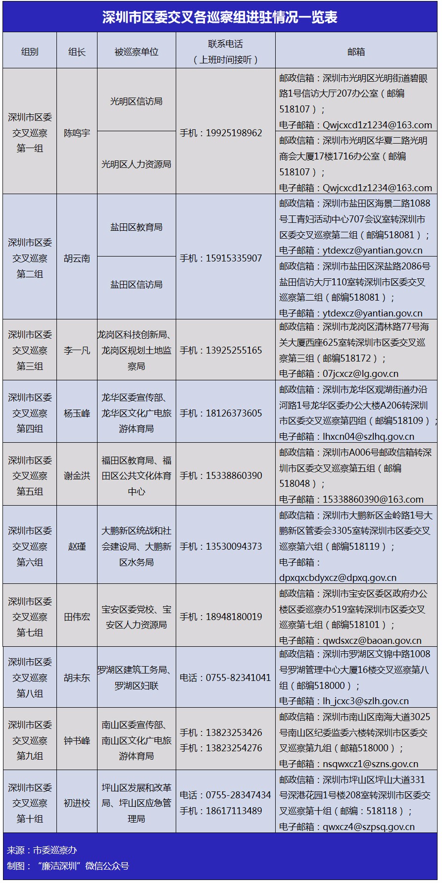 此外,2019年第二輪區級交叉巡察進駐也已全部完成。10個交叉巡察組將對福田區教育局黨組等20個單位黨組織開展異地(跨區)交叉巡察。