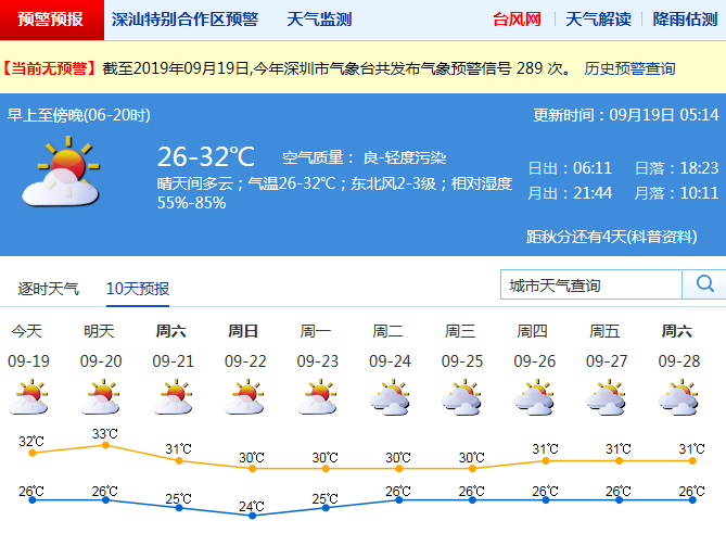 見圳客戶端·深圳新聞網(wǎng)2019年9月19日訊 記者從深圳市氣象局獲悉19日晴天間多云,氣溫26-33℃;20-23日持續(xù)晴熱干燥。其中菲律賓以東洋面的熱帶擾動云團正在發(fā)展,預(yù)計其總體趨勢北上,對我市以及華南沿海無明顯風雨影響,但20日前后將受其外圍偏北下沉氣流影響。