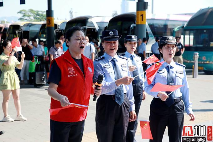 此時,一首熟悉的《我和我的祖國》在人群中突然響起,引得周邊旅客紛紛駐足觀望。原來,深圳灣邊檢站民警為慶祝新中國成立70周年精心準備的快閃節目此刻上演。隨后《我愛你中國》、《紅旗飄飄》依次唱響,現場的旅客逐漸圍攏過來,有和著旋律揮動著國旗的,有拿起手機記錄下這激動時刻的,現場變成一片紅色的海洋。其中一位年近七旬的李大爺激動地說“聽到這旋律、看到五星紅旗心中就非常激動。我是一名老兵,我為我們的祖國感到驕傲自豪”,說話間,老人眼中泛起了淚花。快閃表演結束后,大批旅客還不愿離去,大家紛紛舉起手機,拿起國旗,拍下此刻最美的自拍,向祖國獻上最真摯的祝福:祝愿祖國明天更美好!