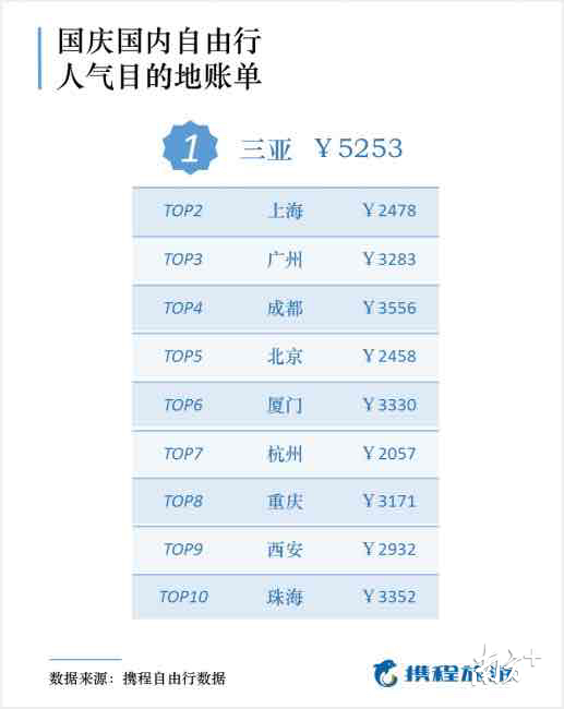 而哪些目的地在國慶期間最能吸引自由行游客?根據攜程自由行數據,三亞、上海、廣州、成都、北京、廈門、杭州、重慶、西安和珠海。其中國慶前往三亞度假已經成為潮流,單次人均花費為5253元。