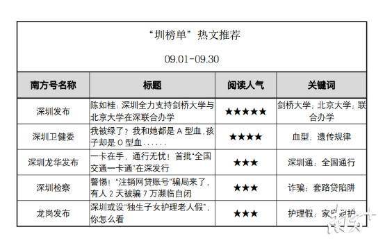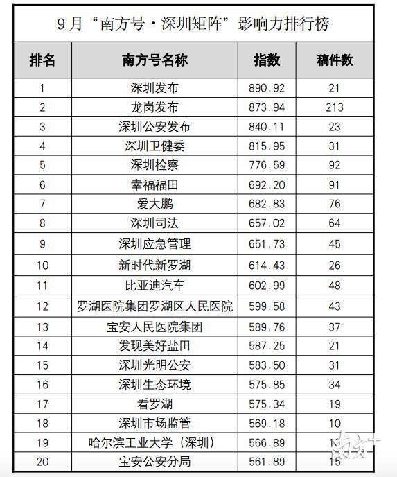 一直以來,公安類南方號都是“南方號·深圳矩陣”熱號,其中以南方號”深圳公安發布”最為突出,曾經取得榜單十三連冠的好成績。9月,“深圳公安發布”位列第三,發布23篇稿件,南方號指數840.11。