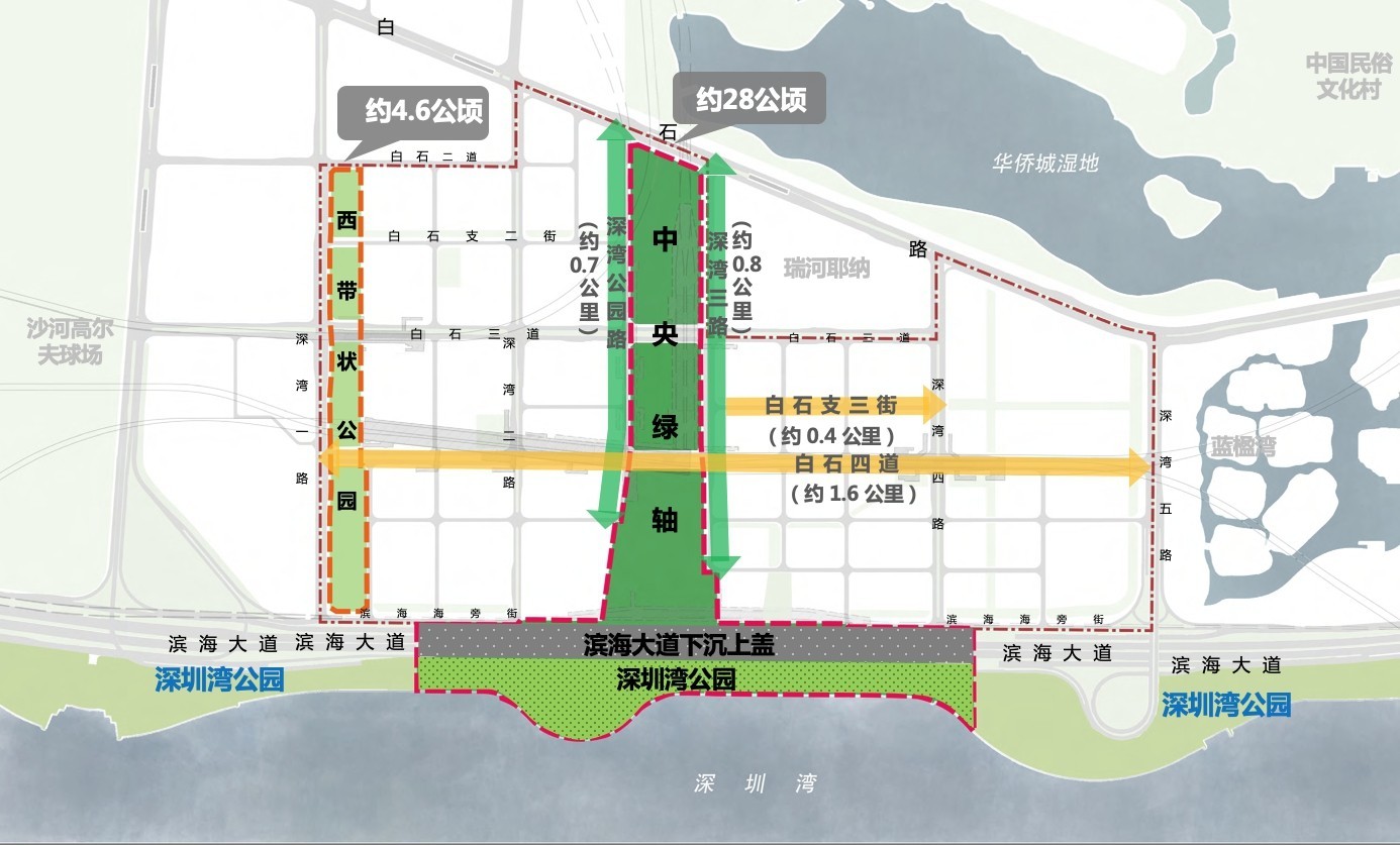 國際咨詢的重點設計范圍為中央綠軸(約28公頃,含濱海大道下沉上蓋和深圳灣公園部分區域)(含深灣公園路、深灣三路街道空間)、片區重要街道(白石四道、白石支三街)、西帶狀公園(約4.6公頃)等。