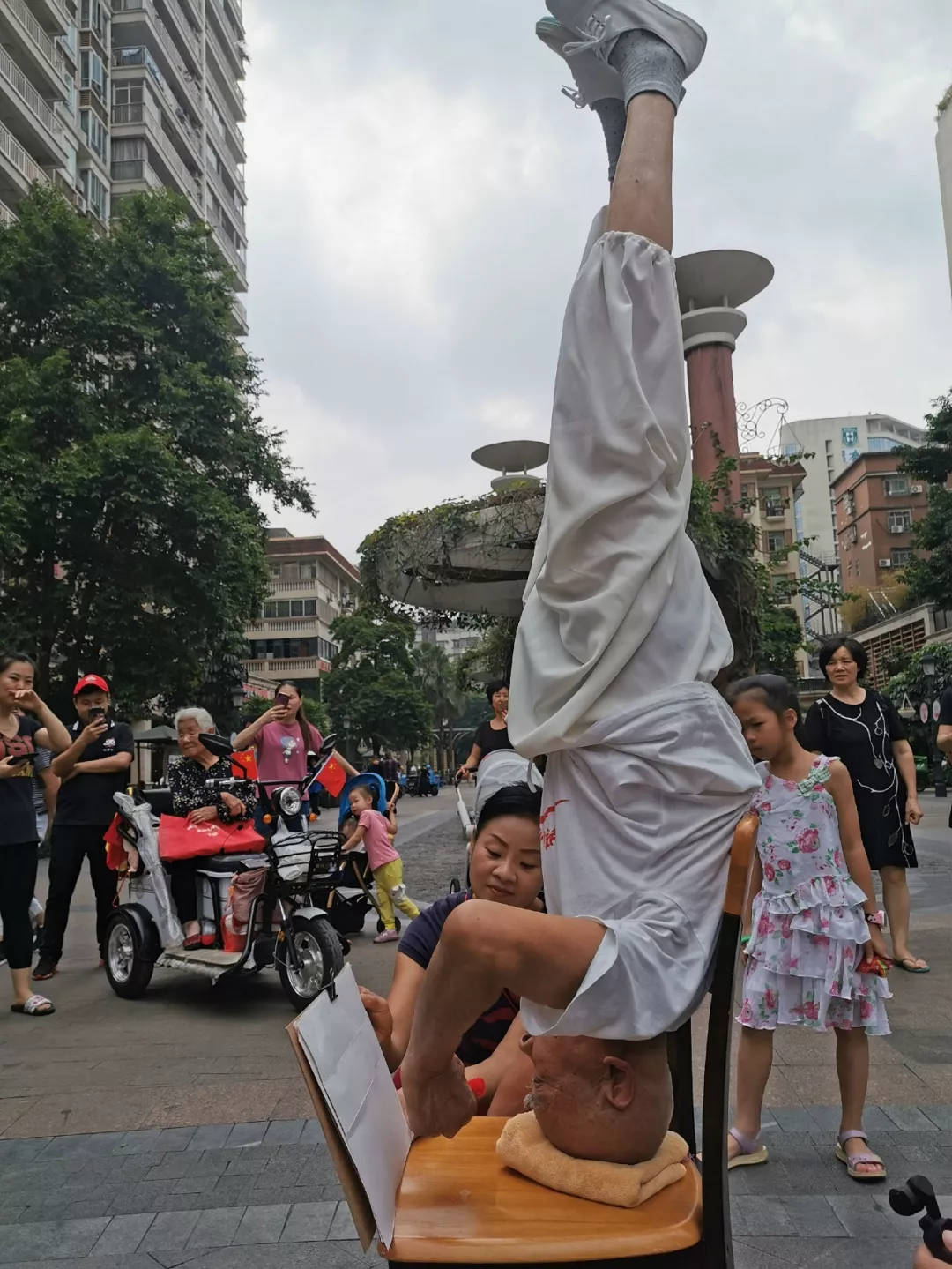 蛇口消息報2019年11月4日訊 頭著板凳倒立、雙手寫字、倒立喝水、倒立吊環,倒立唱歌……做這些高難度動作的人居然是一位85歲高齡的老人。