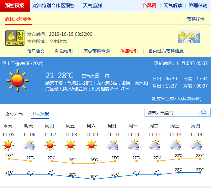 見圳客戶端·深圳新聞網2019年11月5日訊 深圳市氣象局預計5日晴天干燥;氣溫21-28℃;東北風3級,陣風6級;相對濕度45%-75% 。6-10日多云到晴天,空氣干燥,沿海、高地和海區最大陣風可達7級左右,氣溫小幅波動,1字頭氣溫或將再現。