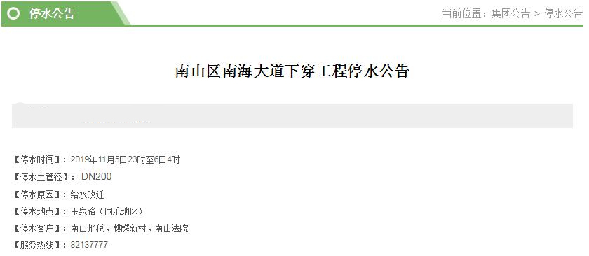 見圳客戶端·深圳新聞網2019年11月5日訊 記者從深圳水務集團獲悉,因給水改遷等原因,11月5日-7日,南山多個小區將停水。具體安排如下: