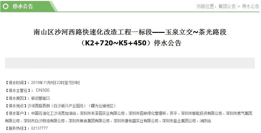 停水客戶:中國石油化工沙河西加油站、深圳市豐澤園實業有限公司、深圳市園林綠化管理所、蘇平、深圳市郁能投資有限公司、深圳市燃氣集團有限公司、深圳市白沙物流有限公司、深圳市糧食集團有限公司、深圳市康和盛實業有限公司、深圳市鹽業集團公司、消防站
