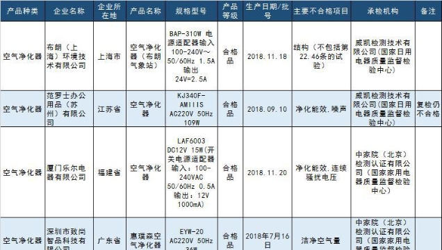 11批次不合格空氣凈化器產品名單