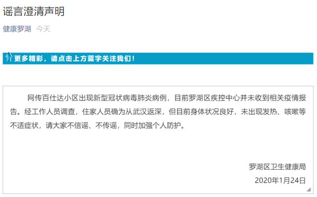 見圳客戶端·深圳新聞網2020年1月24日訊 據羅湖區衛生健康局消息,網傳百仕達小區出現新型冠狀病毒肺炎病例,目前羅湖區疾控中心并未收到相關疫情報告。