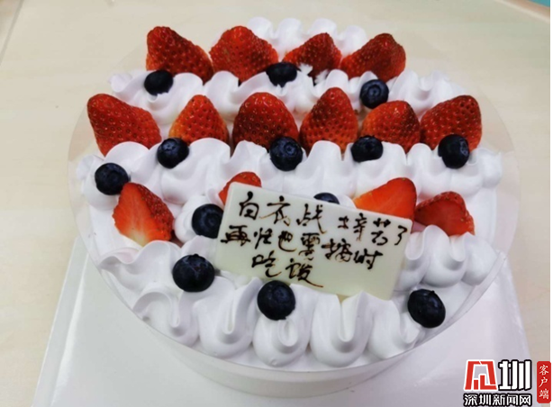 也有動情的時刻。有不知名的患者,看著我們忙碌辛勤、連飯顧不上吃一口、連水來不及喝一口,偷偷送上一份香甜蛋糕。蛋糕上寫著“白衣戰士辛苦了,再忙也要按時吃飯”,沒有留下一個名字。