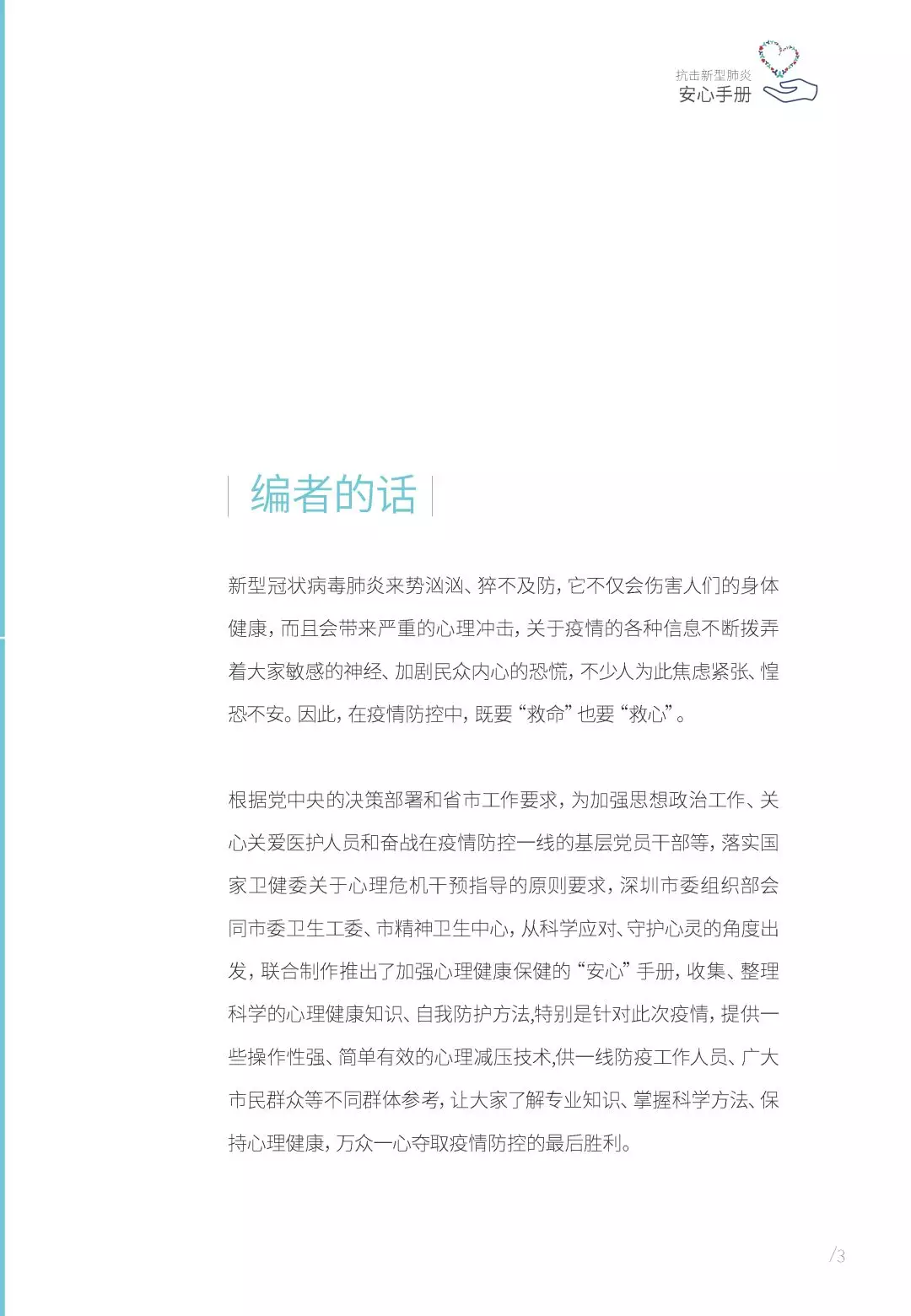 根據黨中央的決策部署和省市工作要求,為加強思想政治工作、關心關愛醫護人員和奮戰在疫情防控一線的基層黨員干部等,落實國家衛健委關于心理危機干預指導的原則要求,深圳市委組織部會同市委衛生工委、市精神衛生中心,從科學應對、守護心靈的角度出發,聯合制作推出了加強心理健康保健的“安心”手冊,收集、整理科學的心理健康知識、自我防護方法,特別是針對此次疫情,提供一些操作性強、簡單有效的心理減壓技術,供一線防疫工作人員、廣大市民群眾等不同群體參考,讓大家了解專業知識、掌握科學方法、保持心理健康,萬眾一心奪取疫情防控的最后勝利。