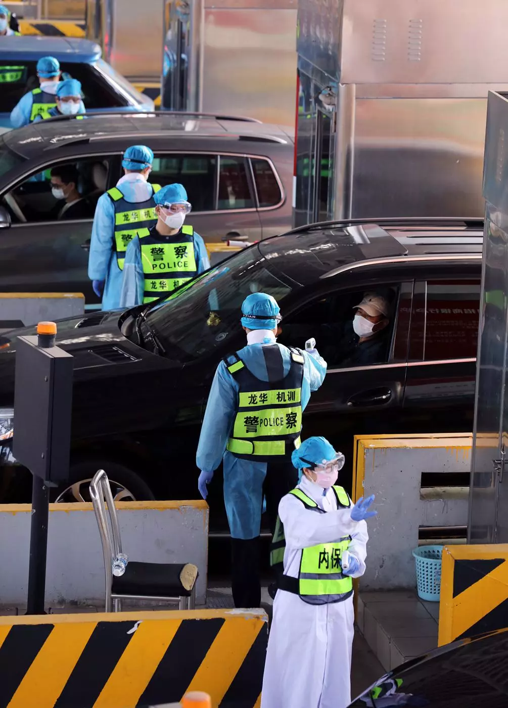 執(zhí)勤民警協(xié)助醫(yī)務(wù)人員對入深車輛上的人員進(jìn)行體溫檢測。