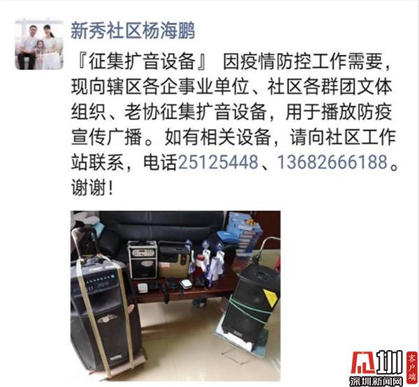 疫情面前,小廣播能發揮大作用,方便大力宣傳防疫知識。疫情在不斷蔓延,廣播宣傳任務任務緊急,而其中新秀社區一時沒有足夠的擴音設備,于是,立即向居民、社會團體、企業等發出征集令。新秀社區黨委書記楊海鵬在微信朋友圈發布了征集信息及聯系電話。沒想到這征集令一發出,很快就得到了市民朋友的積極響應。