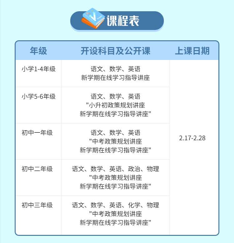 據悉,本次公益校內同步直播課程涵蓋各年級(1-9年級),各學科(語文、數學、英語、政治、物理、化學等)。“覆蓋廣、課程精、師資強、服務優、全免費”是本次直播課程的特色亮點。