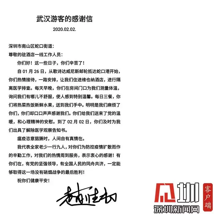 ▲威尼斯郵輪解除醫學觀察乘客趙性初的感謝信