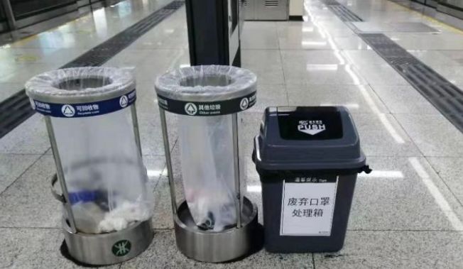深圳地鐵設置廢棄口罩回收桶,在所轄7條線路的200多個車站共投放547個專用垃圾桶,用于回收廢棄口罩等各類防護用品。