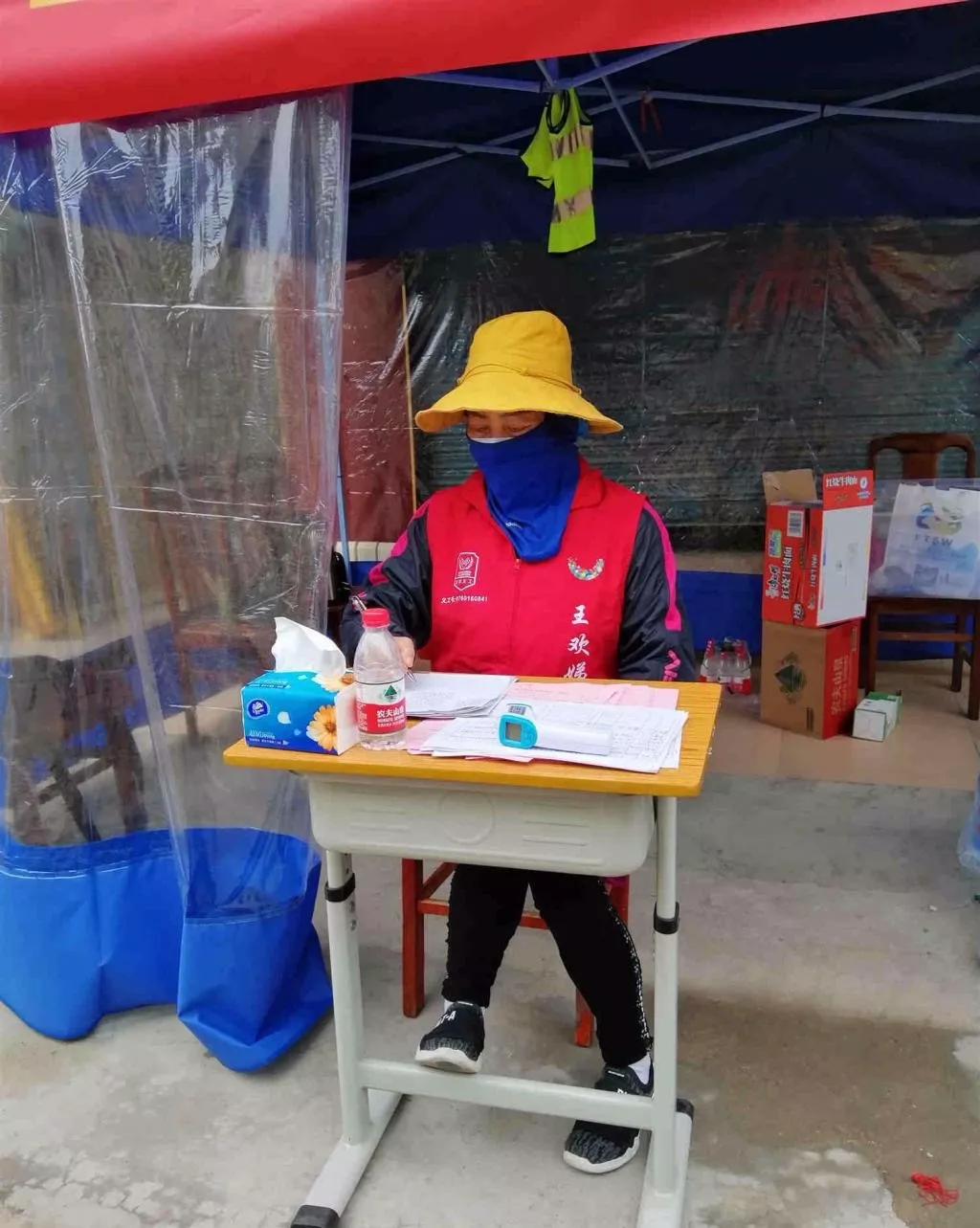 在龍崗區平湖街道力昌社區防控防疫卡點,一名身著紅馬甲的志愿者忙個不停。雖然她的臉被口罩、帽子遮得嚴嚴實實,但紅馬甲上寫著得三個大字透露了她的身份:王歡娣。
