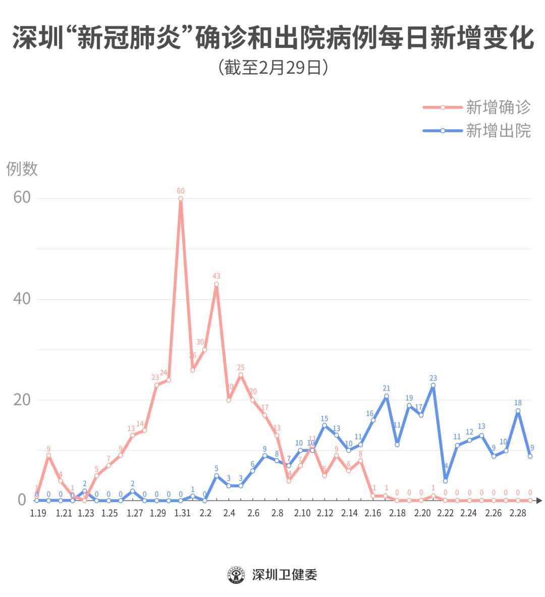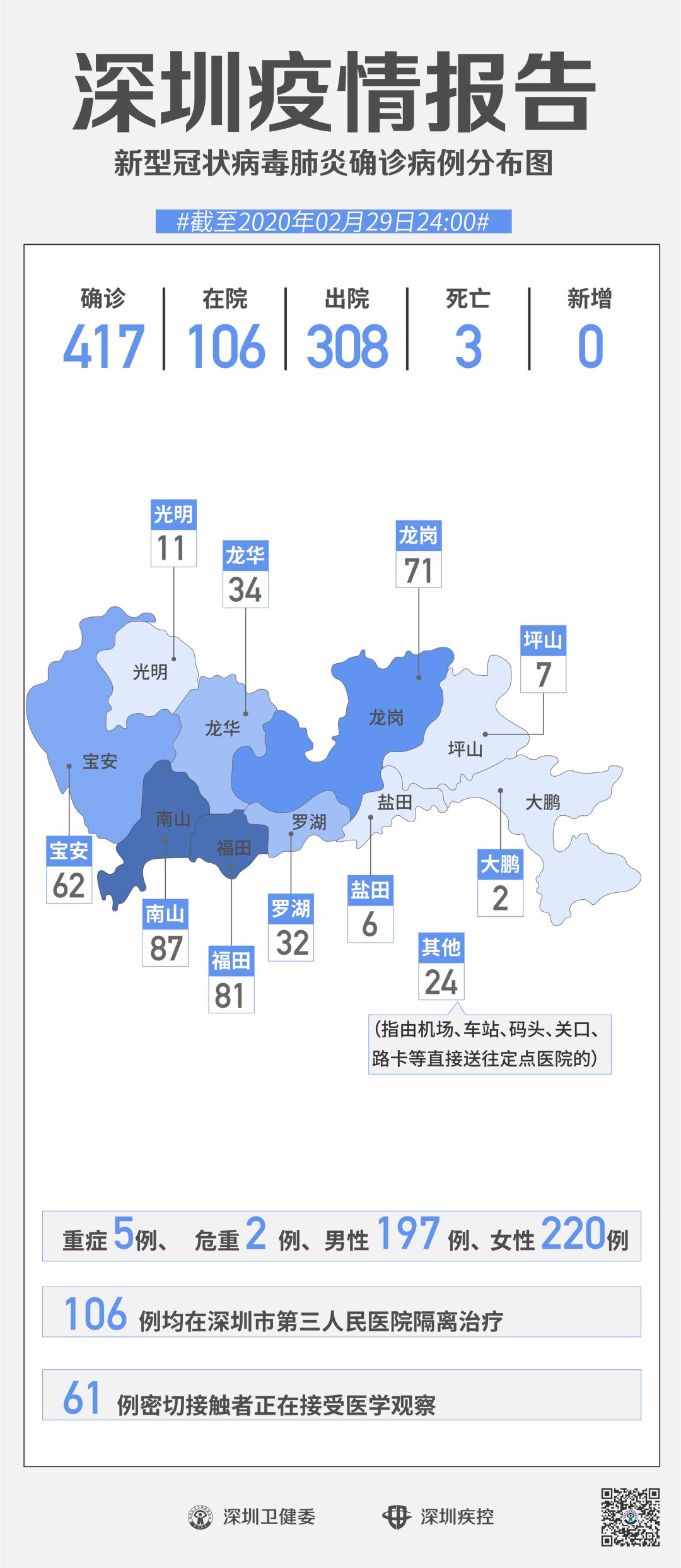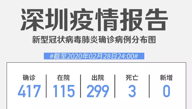 截至2月29日24時(shí),深圳累計(jì)報(bào)告“新冠肺炎”確診病例417例。2月29日當(dāng)天全市無(wú)新增確診病例,當(dāng)天出院病例9例(從26日起不再公布出院個(gè)案)。