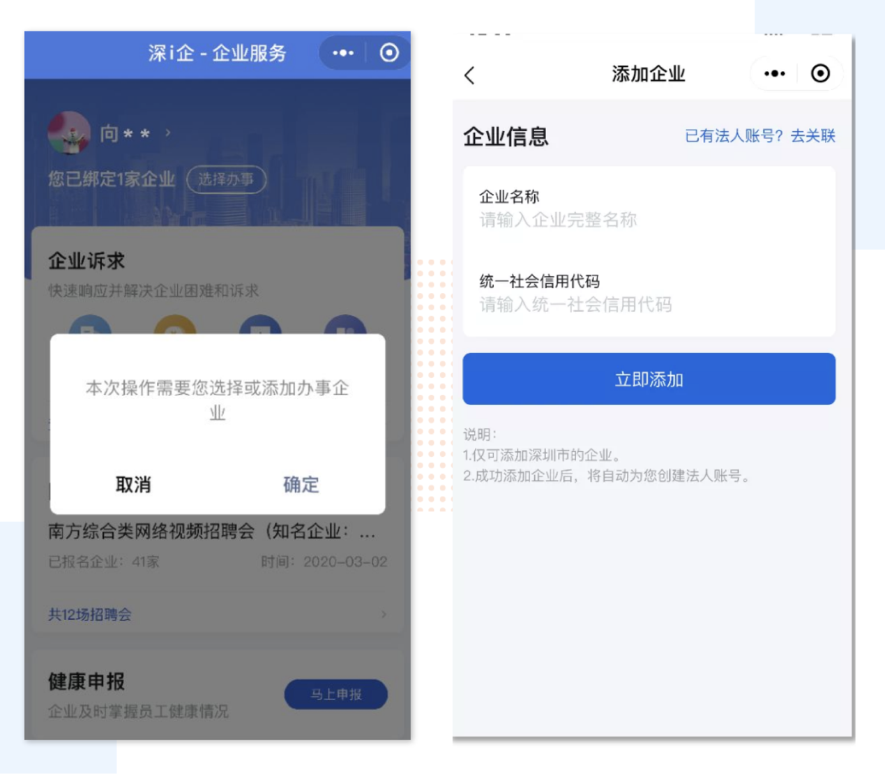 登錄后,進入“深i企-精準服務企業”平臺主頁面,點擊“選擇辦事”。法人或經辦人通過輸入企業名稱和統一社會信用代碼添加辦事企業,也可以通過已有法人賬號關聯企業。