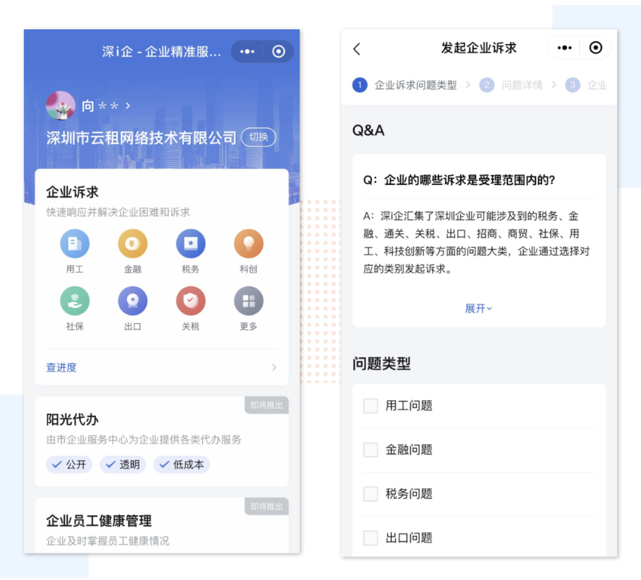 目前,平臺上線的“企業訴求響應”模塊,可以對用工、金融、稅務、科創、社保、出口、關稅、商貿、通關、招商等方面提供訴求響應。企業通過在平臺填報自身目前面臨的問題、困難或者相關訴求信息后,對應職能部門建立了一個專門的訴求處理機制,將對收到的訴求進行第一時間研究并予以優先解答,形成企業第一時間反映訴求、政府第一時間處理訴求、第一時間解決訴求的閉環管理鏈條。同時,還建立了上門服務的機制,企業在平臺里面提出的典型訴求,政府工作人員將會安排上門核實了解情況,以更好推動訴求的解決。