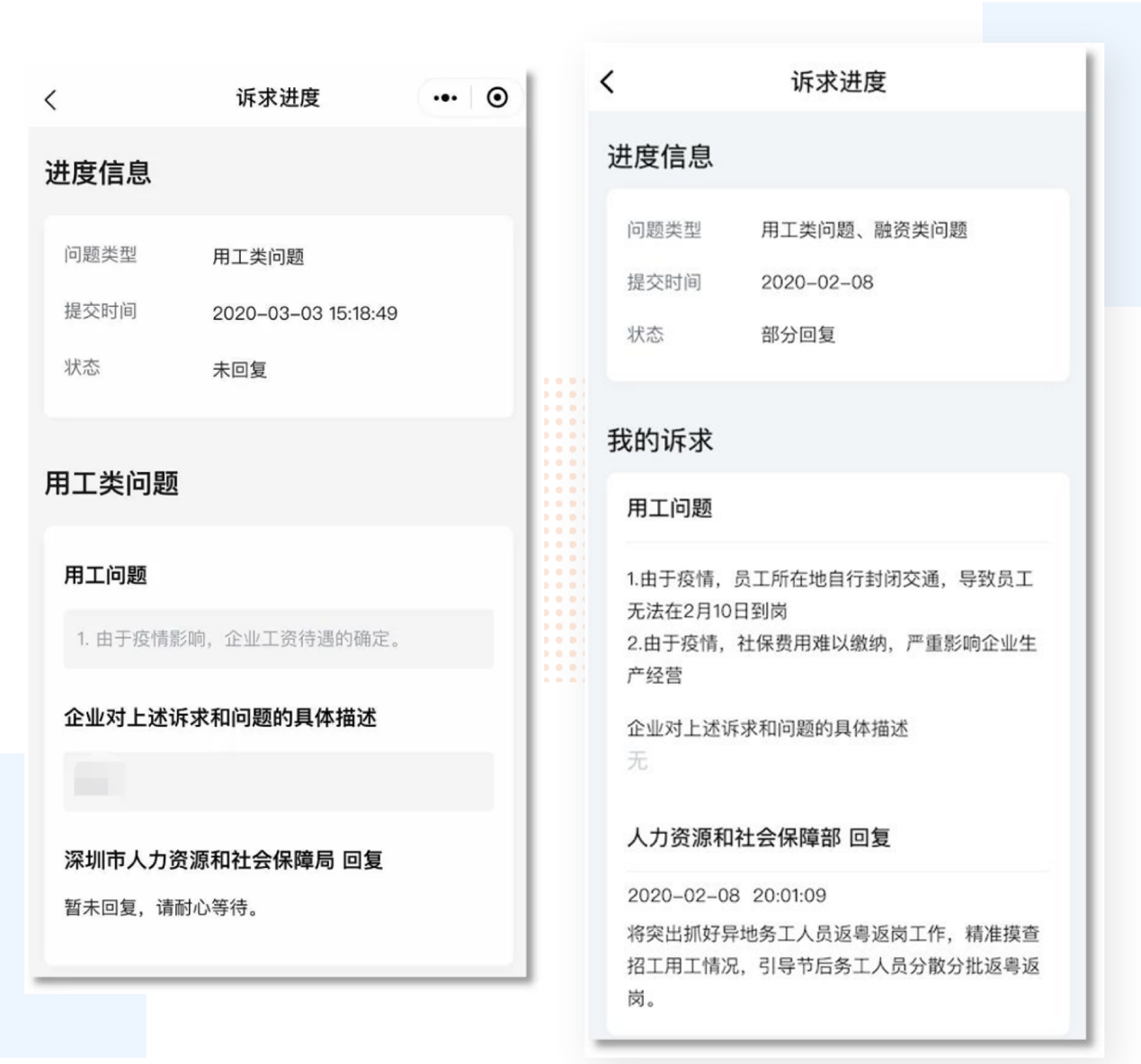 訴求提交成功后,可在首頁“企業訴求”服務下方點擊“查進度”,查看訴求處理進度以及相關政府部門回復的詳細信息。現有政策可以解決的原則上不超過24小時,現有政策不能解決或需要多個部門辦理的,3天內響應處理,同時進度情況也將以短信方式通知。
