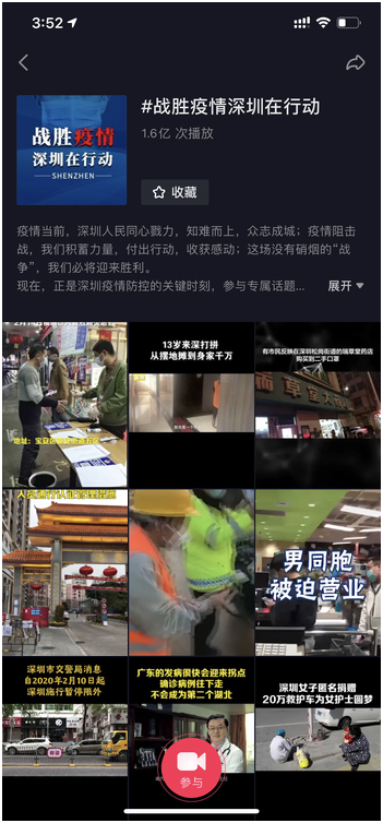 疫情防控期間,深圳市的政務頭條號和政務抖音號也“大放異彩”。以今日頭條和抖音兩個熱門平臺來看,抖音話題#戰勝疫情深圳在行動#截至2月26日已累計1.6億次播放,參與視頻數262個。