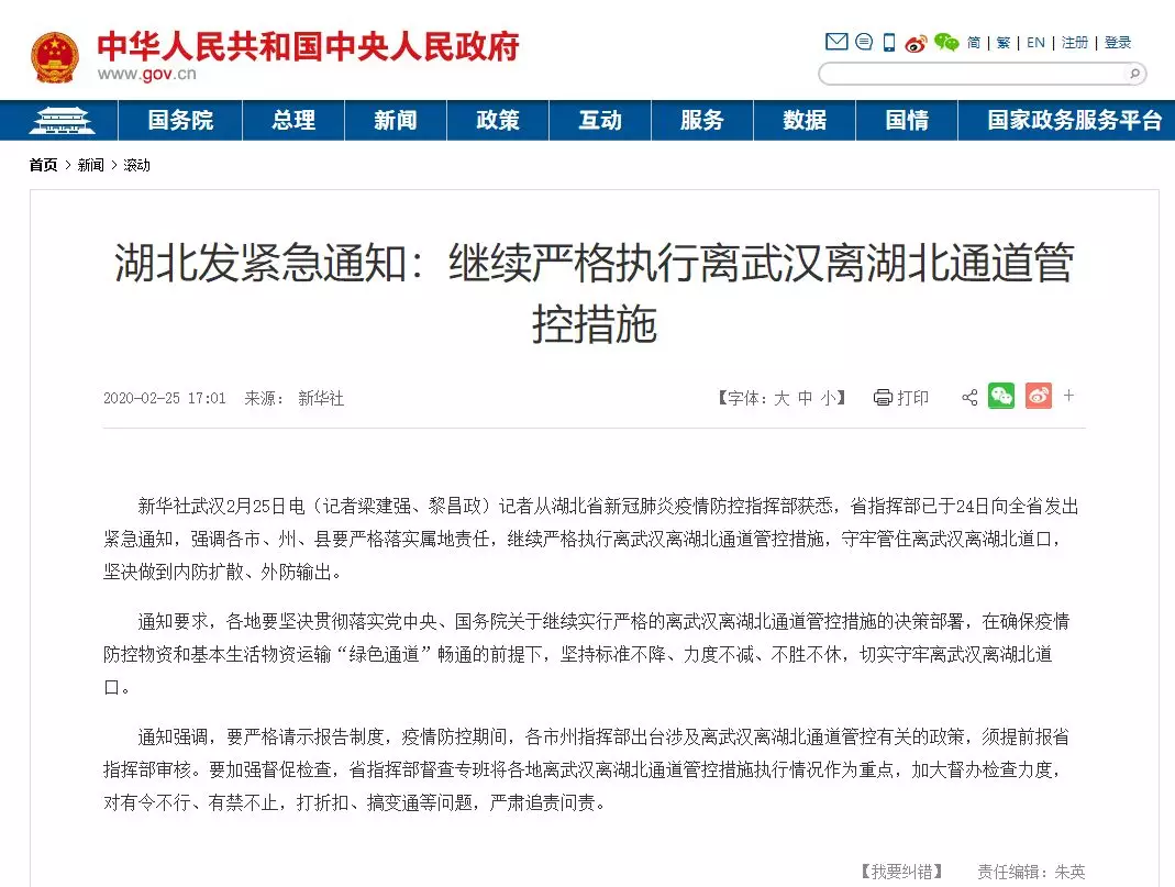 根據湖北的緊急通知,繼續嚴格執行離武漢離湖北通道管控措施。