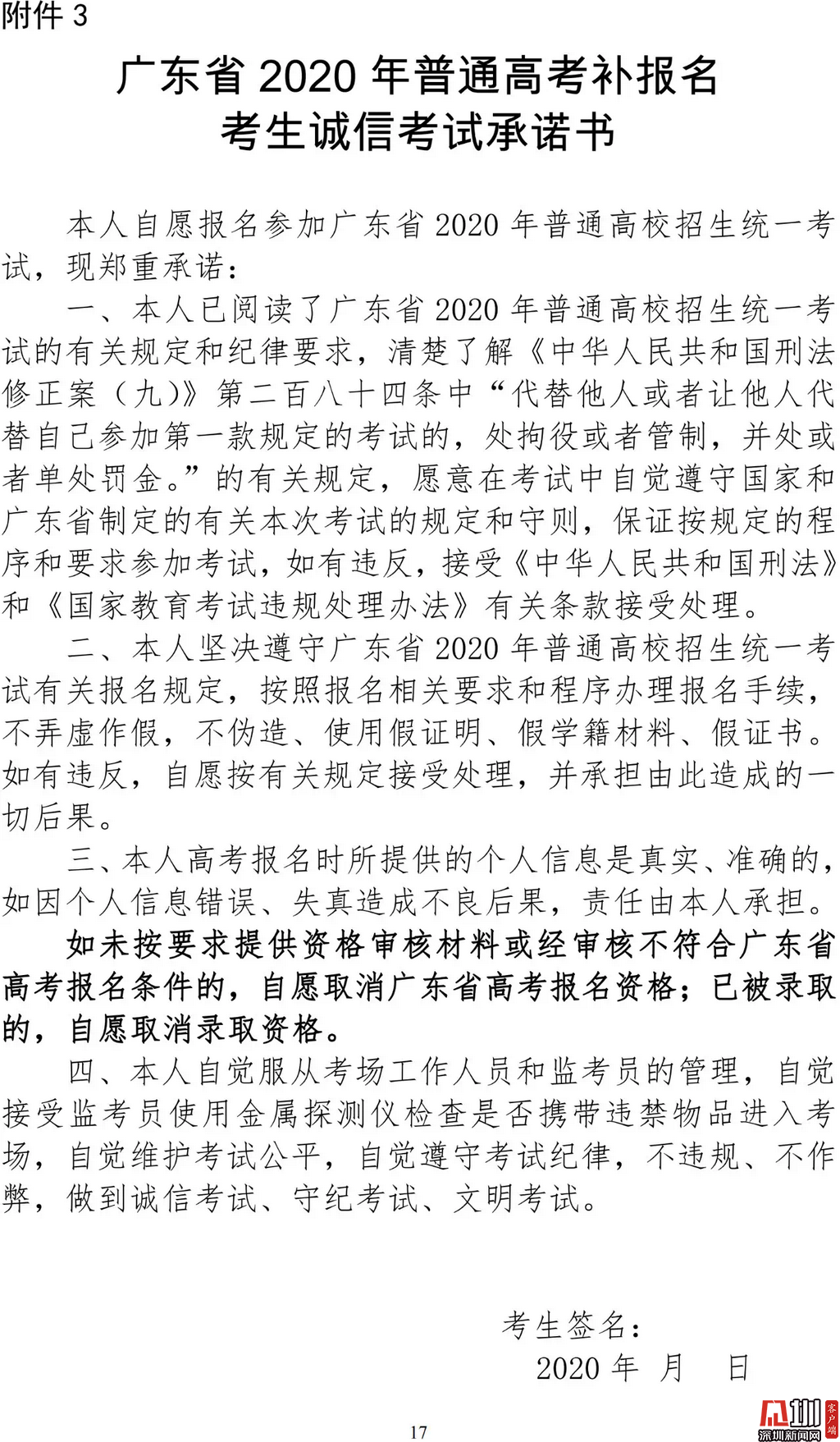 見圳客戶端·深圳新聞網2020年3月19日訊(見圳客戶端、深圳新聞網記者 金洪竹)3月18日,記者從廣東省招生委員會辦公室獲悉,為滿足退伍軍人、運動訓練及武術與民族傳統體育考生、高職院校自主招生考生等符合我省高考條件,因各種原因尚未參加高考報名人員的需求,經研究決定安排一次高考補報名,補報名時間為3月23-26日。同時,為確保考生和考試工作人員的生命安全和身體健康,減少聚集,本次高考補報名采取先線上辦理、后補驗材料的方式進行。