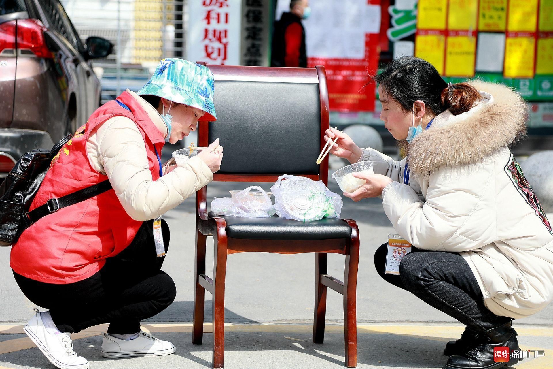 3月7日,監利,在街頭執勤卡點吃飯的社區工作人員。