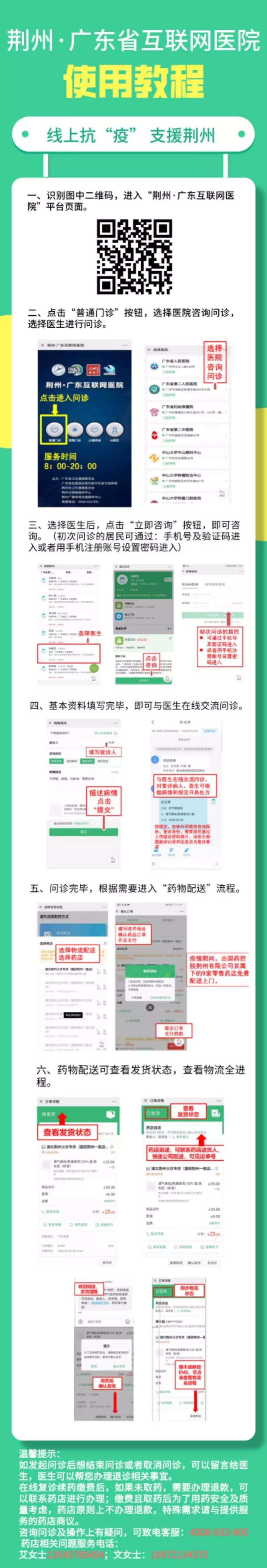 荊州廣東互聯網醫院自2月29日上線,依托廣東優質線上服務資源,為荊州市民提供的常見病慢性病復診、就診指導、新冠肺炎咨詢、心理疏導、健康宣教、健康評估、送藥上門等免費服務在疫情期間為荊州市民就診和用藥提供方便。