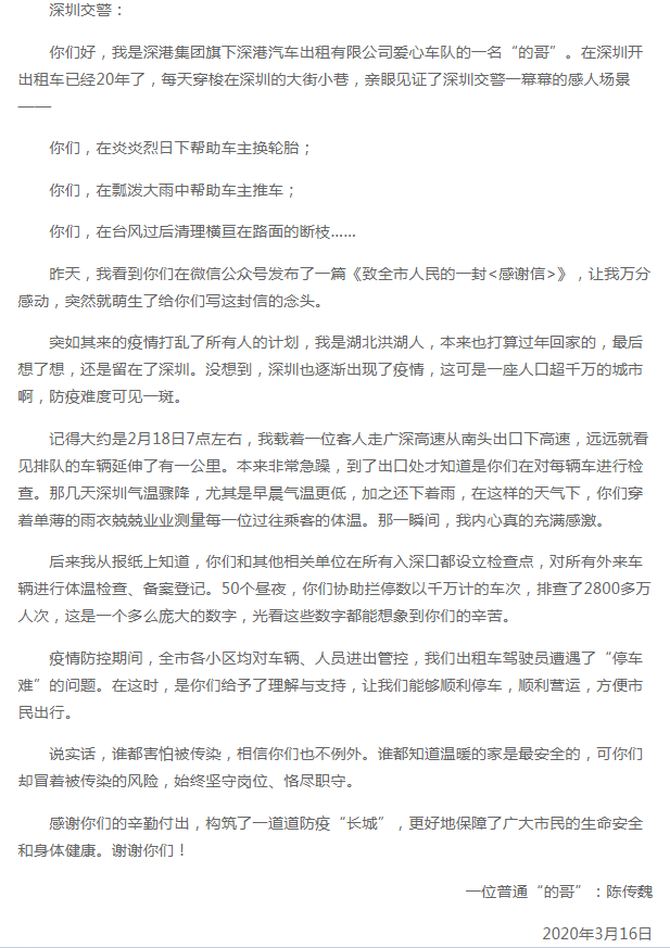 3月16日,深圳交警在微信公眾號發了一封感謝信。
