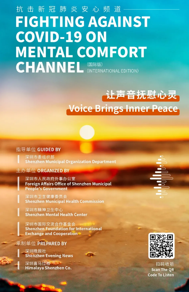 在疫情面前,每一份信念都意義重大,每一個希望都影響深遠。4月11日,抗擊新冠肺炎安心頻道(國際版)在喜馬拉雅 APP正式上線。該欄目在深圳市委組織部的指導下,由深圳市外辦攜手深圳市衛健委、深圳市精神衛生中心、深圳市國際交流合作基金會聯合出品,由深圳晚報和深圳喜馬拉雅共同承制。據悉,抗擊新冠肺炎安心頻道(國際版)是深圳市外辦首次聯合多部門協作,共同出品的全英文音頻欄目,也是繼"抗擊新型肺炎安心手冊音頻版"推出以來的又一大創新。該欄目的推出體現了深圳對中外居民的人文關懷,也展現了深圳作為國際化城市的溫暖大愛。