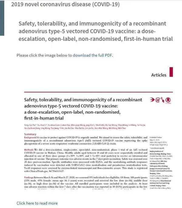 稍早前,5月22日中午,國際學術期刊《柳葉刀》(The Lancet)方面向澎湃新聞表示,該期刊已確認接受中國工程院院士、軍事科學院軍事醫學研究院生物工程研究所陳薇團隊關于新冠疫苗臨床試驗結果的研究論文;“走的是快速(評審)通道”;目前正在進一步處理中,處理完就在線(online)發表。
