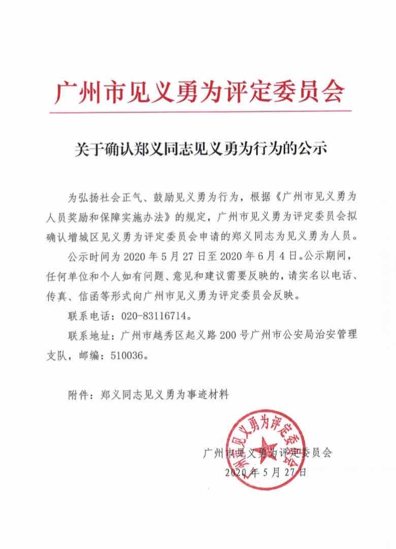 5月27日,廣州市見義勇為評定委員會發出《關于確認鄭義同志見義勇為行為的公示》,擬確認鄭義同志為見義勇為人員。