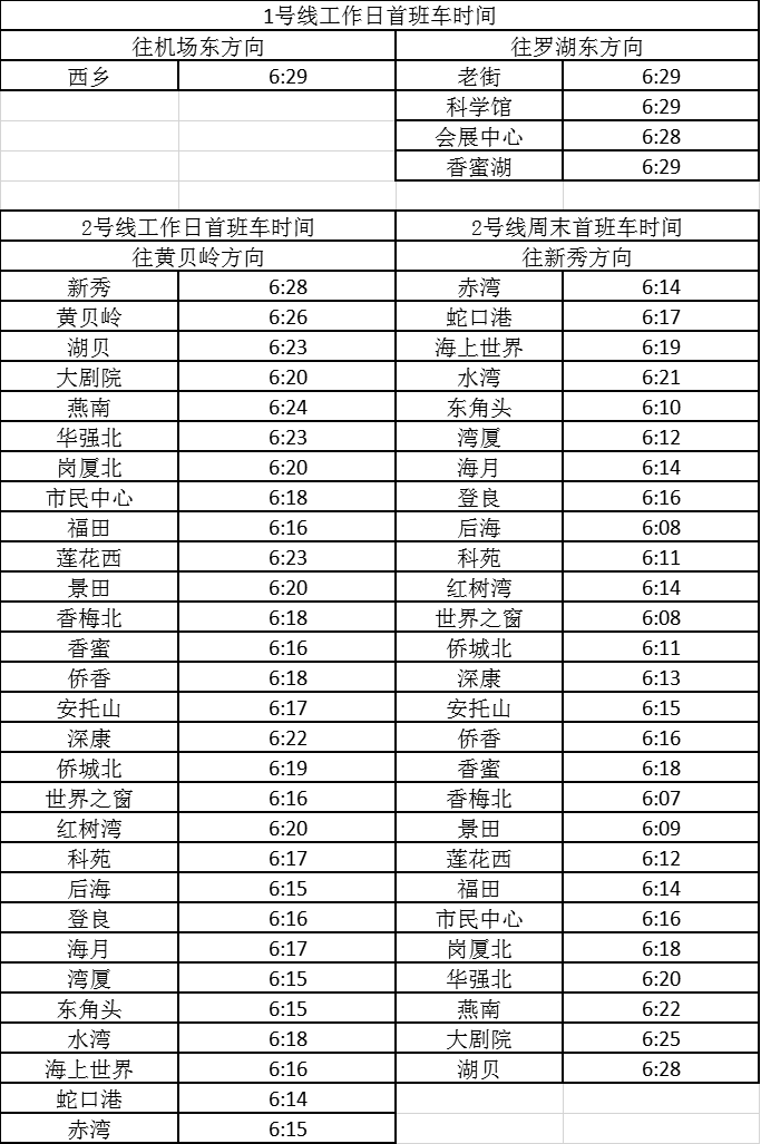 記者獲悉,經優化調整后,各線路工作日首班車最早發車站點及時間分別為,1號線老街站6:29、2號線蛇口港站6:14、3號線塘坑站6:05、5號線坂田站6:01、7號線赤尾6:09、9號線銀湖6:05、11號線機場站6:04。周末期間首班車最早發車站點及時間分別為,2號線香梅北站6:07、3號線塘坑站6:04、5號線長嶺陂站6:00、7號線皇崗口岸站6:09、9號線孖嶺站6:05、11號線機場站6:03。