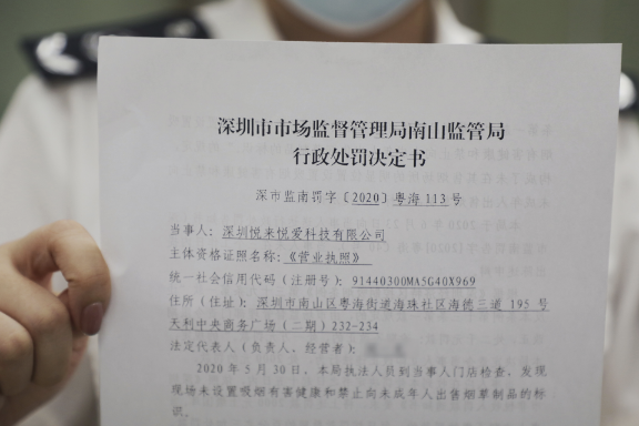 經(jīng)過(guò)近2個(gè)月的調(diào)查,7月21日,深圳悅來(lái)悅愛科技有限公司正式簽收深圳市市場(chǎng)監(jiān)督管理局南山分局粵海所開出的行政處罰決定書,罰款2000元。