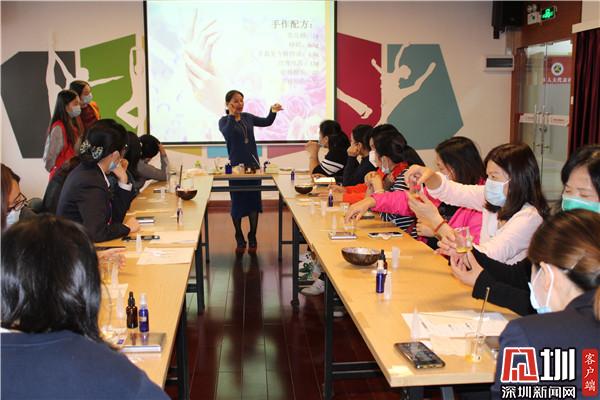 據了解,劉燦輝浸染芳香研究十幾年,有著豐富的芳療經驗。在課堂上,劉燦輝耐心地引導社區婦女在芳香中忘掉壓力和煩惱,體驗愉快,開拓出精神力量。20位社區婦女還在老師的帶領下,動手制作潤手霜。大家相互幫助,彼此配合,經過調試、攪拌、加熱、瓶裝等過程,每位學員都擁有了一支專屬于自己的潤手霜。