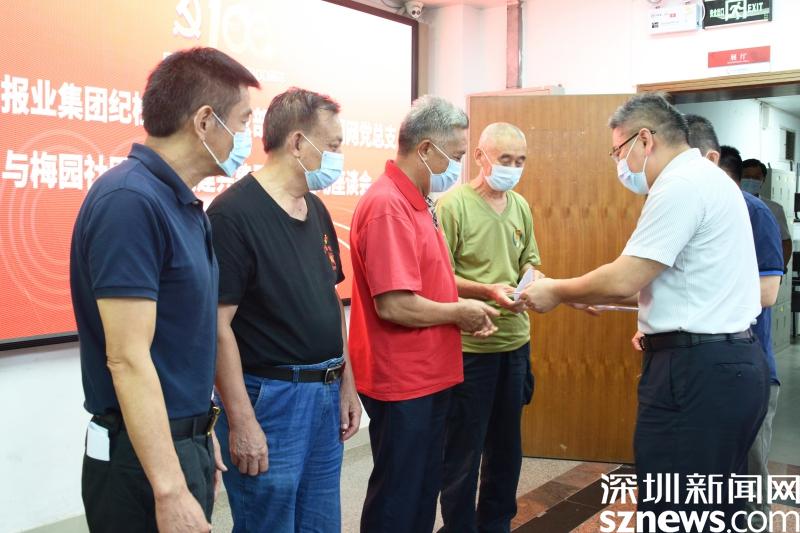 讀特客戶端·深圳新聞網2021年7月2日訊(記者 劉晨 見習記者 邱婕)為慶祝中國共產黨建黨100周年,共同促進黨建共建單位友誼,7月2日上午,市紀委監委駐報業集團紀檢監察組組長、報業集團黨組成員陳鵬帶領深圳新聞網黨總支成員一行來到羅湖區清水河街道梅園社區,同梅園社區黨委開展黨建共建座談會及慰問活動,并向“光榮在黨50年”老黨員頒發紀念章。