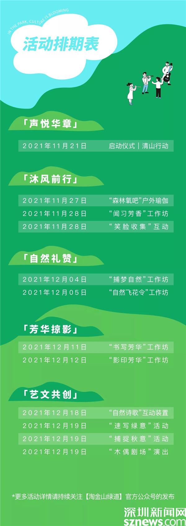 據悉,自11月27日起連續四個周末,深圳公園文化季羅湖分會場將帶來一系列健康療愈、藝術文化、傳統文化等戶外活動,市民可以通過關注“淘金山綠道”公眾號了解更多活動詳情,報名參加。