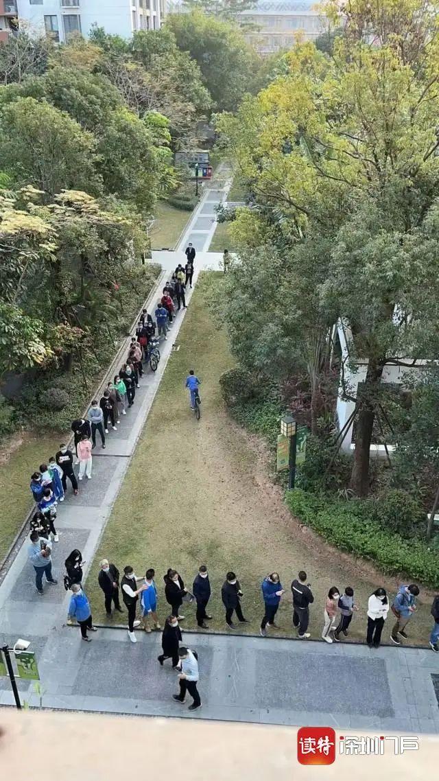 ▲坂田星河銀湖谷樓下也排起長長的核酸檢測隊伍,除了本地居民,人群里還有附近工地的建筑行業從業者、外賣小哥等。