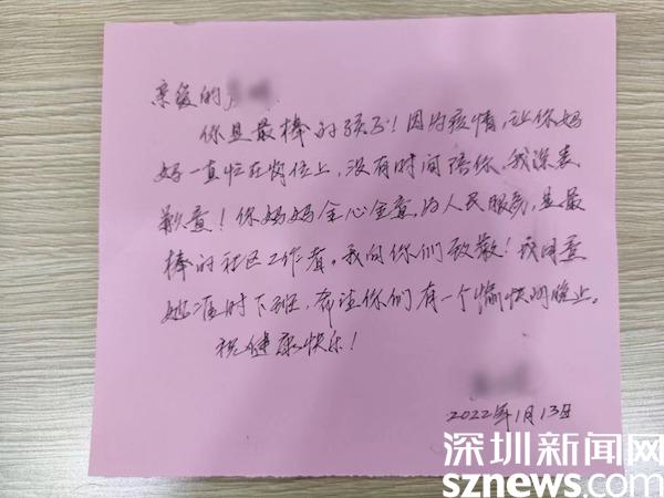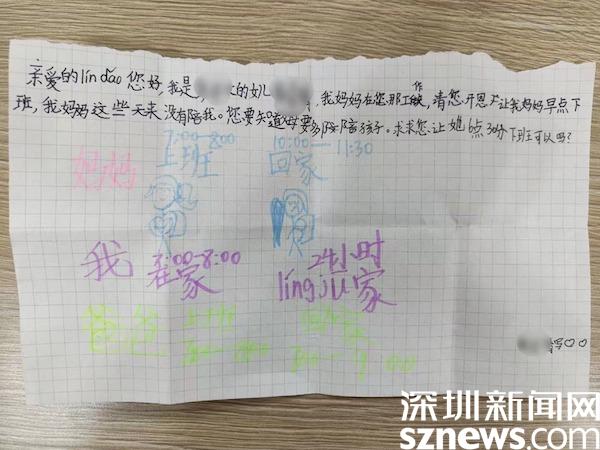讀特客戶端·深圳新聞網1月13日訊(見習記者 覃鈺清 通訊員 張晴晴)“親愛的lín dǎo您好……我媽媽在您那工作,這些天都沒能陪我,請你讓她6點30分下班可以嗎?”,1月13日,羅湖區南湖街道羅湖社區黨委書記姜德榮收到了一封特別的來信。這封信來自社區工作人員彭女士可愛的女兒,信上的內容圖文并茂,表達了一個10歲小女孩的小心愿,希望媽媽可以早點下班,回家陪她。