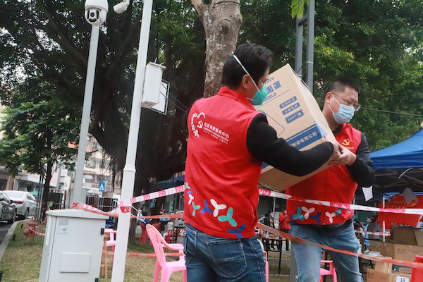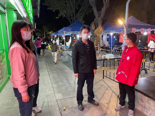 隨后,文促會一行來到了東湖街道大望社區。在社區核酸檢測現場,大望社區黨委書記高桂秀正在指揮現場工作;大望實業公司董事長何雨聰和大望社區副書記李雪康兩人都面帶倦容,明顯近期睡眠嚴重不足。據了解,高桂秀近期一直綁著護腰墊片,帶病堅持抗疫。